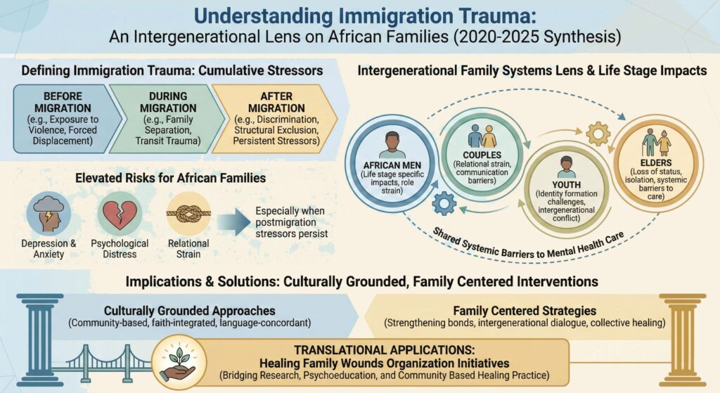 Immigration trauma encompasses cumulative psychological and social stressors experienced before, during, and after migration, including exposure to violence, forced displacement, family separation, discrimination, and structural exclusion. Recent scholarship indicates that African immigrant and refugee families experience elevated risk for depression, anxiety, psychological distress, and relational strain, particularly when postmigration stressors persist. This manuscript synthesizes peer reviewed literature published between 2020 and 2025 to examine how immigration trauma affects African men, couples, youth, and elders through an intergenerational family systems lens. Findings highlight life stage specific impacts and shared systemic barriers to mental health care. Implications are discussed for culturally grounded, family centered interventions, including translational applications through Healing Family Wounds Organization initiatives that bridge research, psychoeducation, and community based healing practice.